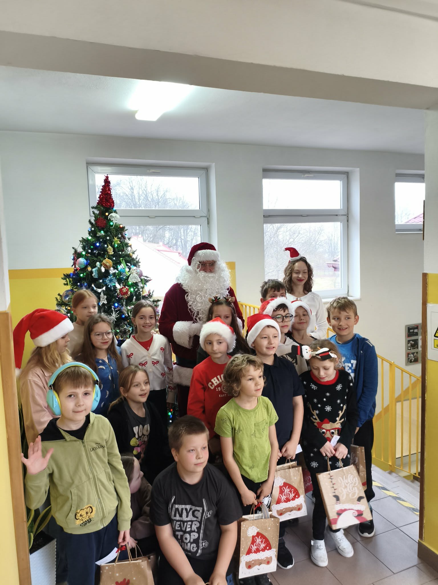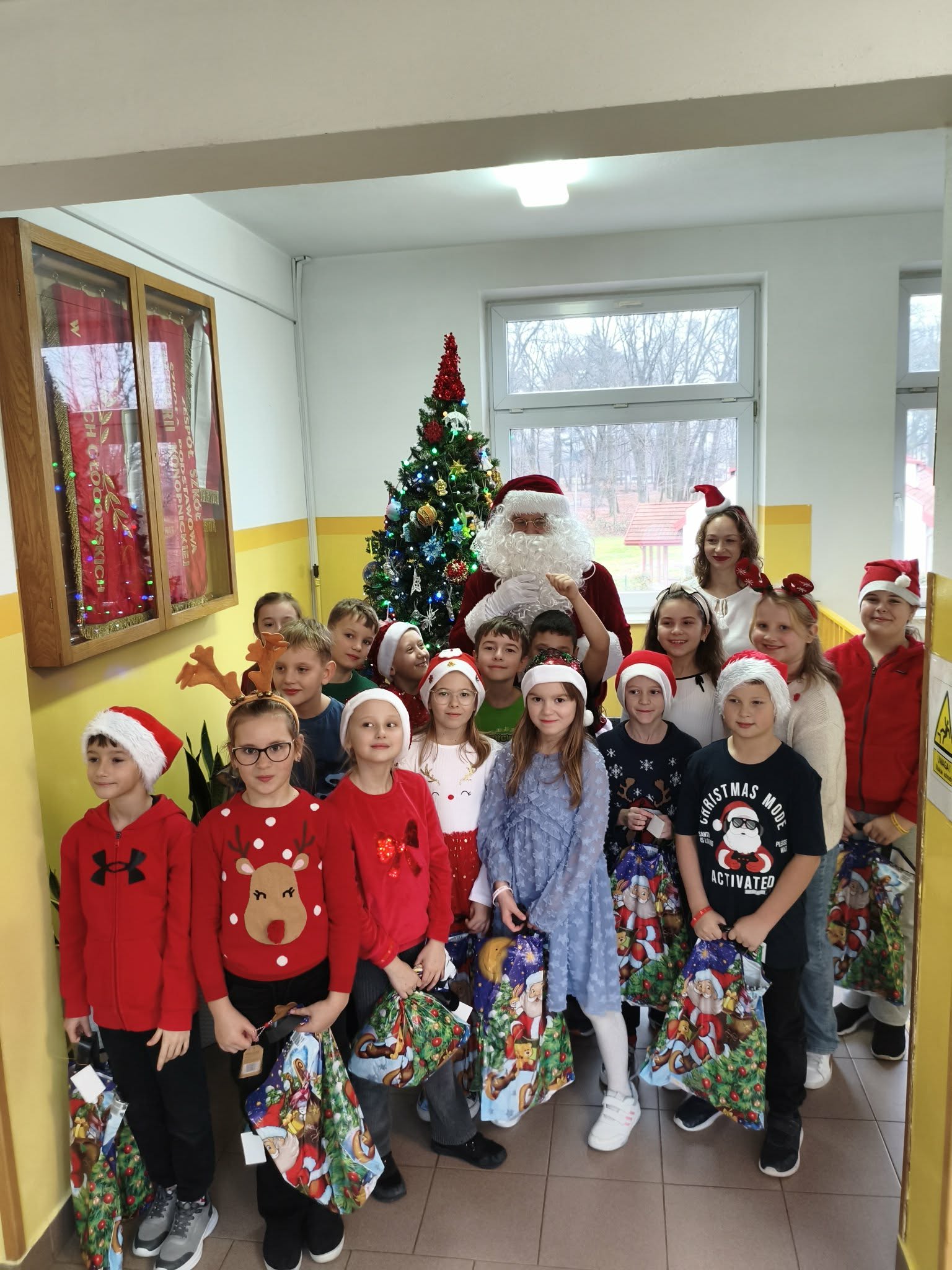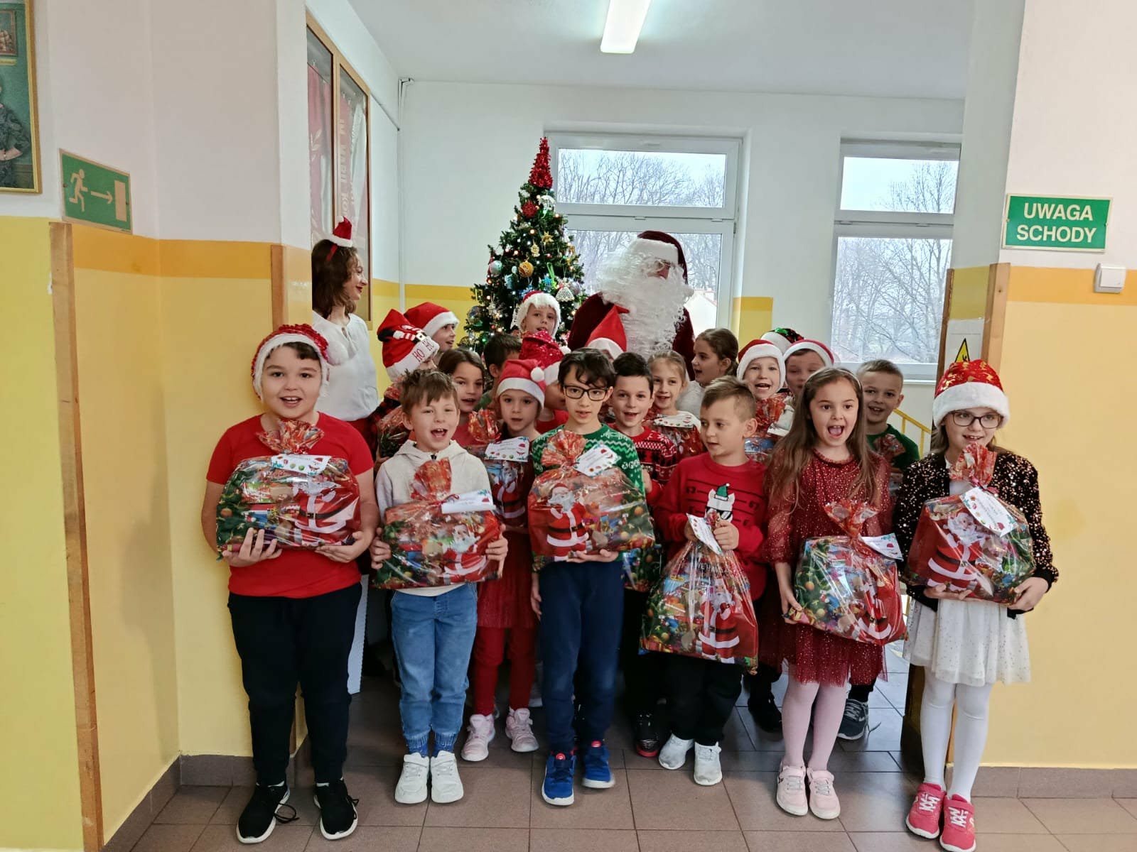 Dnia 5 grudnia odbyło się w naszej szkole spotkanie ze Świętym Mikołajem, przy naszej pięknej, szkolnej choince. Uczniowie klasy drugiej i klas trzecich przywitali miłego gościa śpiewając przygotowane piosenki. Następnie Mikołaj po krótkiej rozmowie z uczniami rozdał dzieciom prezenty. Na zakończenie spotkania klasy zrobiły sobie pamiątkowe zdjęcia. Po powrocie do klasy dzieci rozmawiały o spotkaniu i z wypiekami na twarzy rozpakowały otrzymane upominki. Przez wszystkie przerwy bawiły się zabawkami otrzymanymi od miłego gościa.