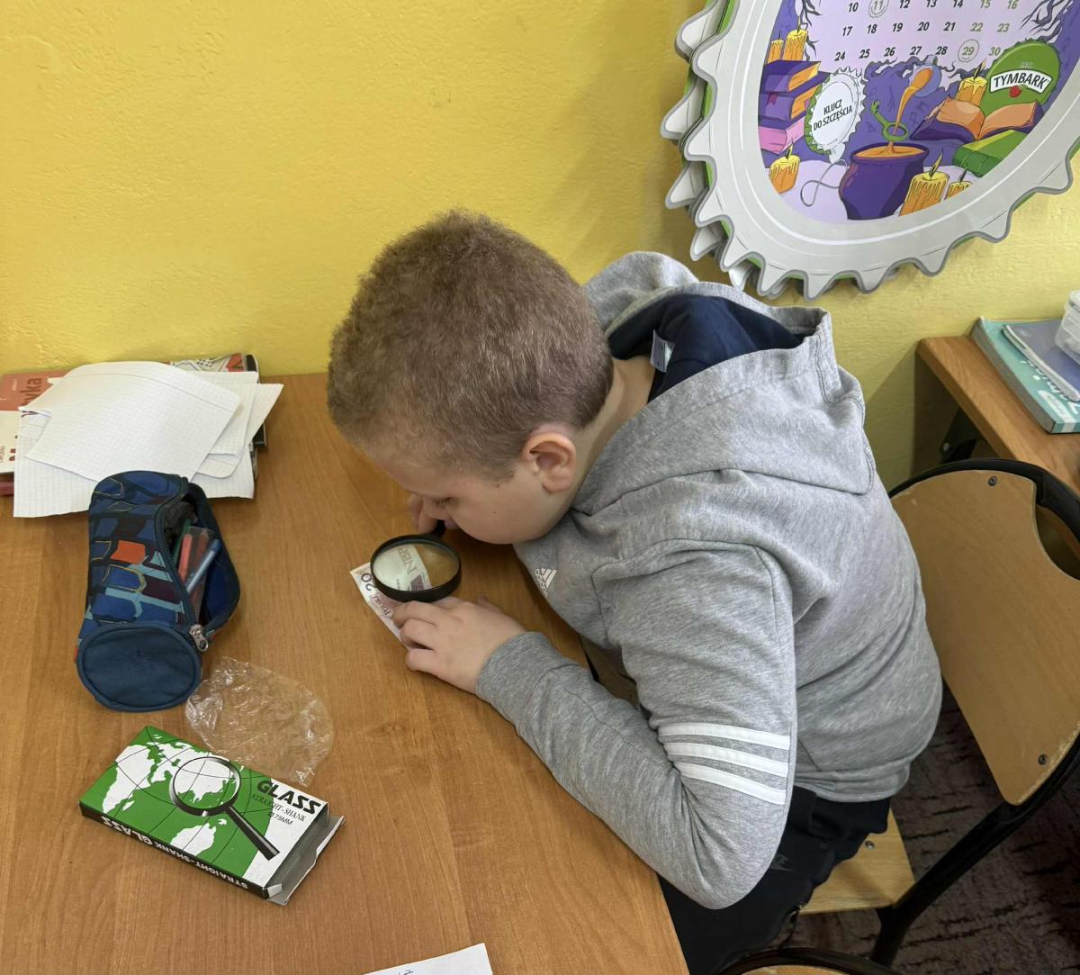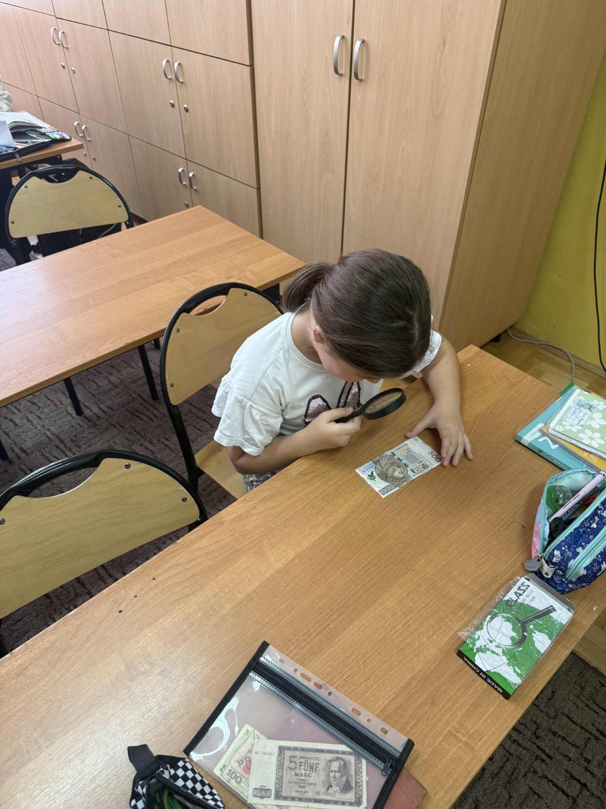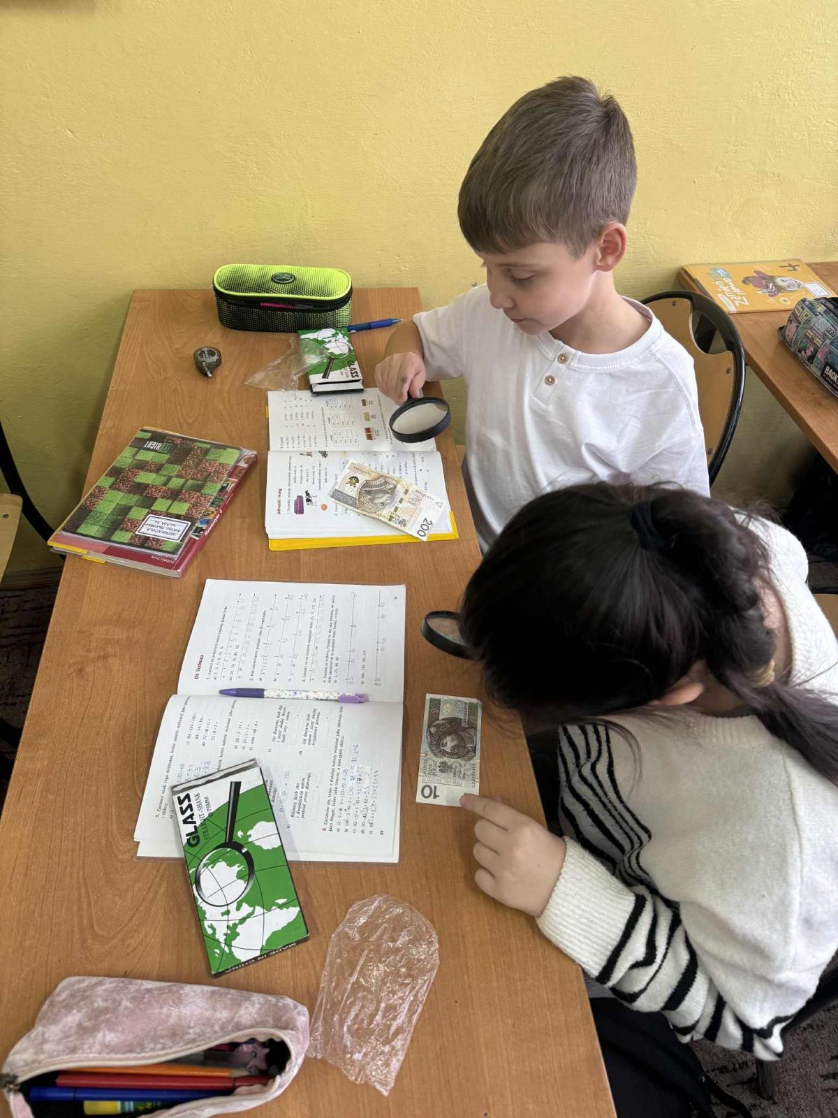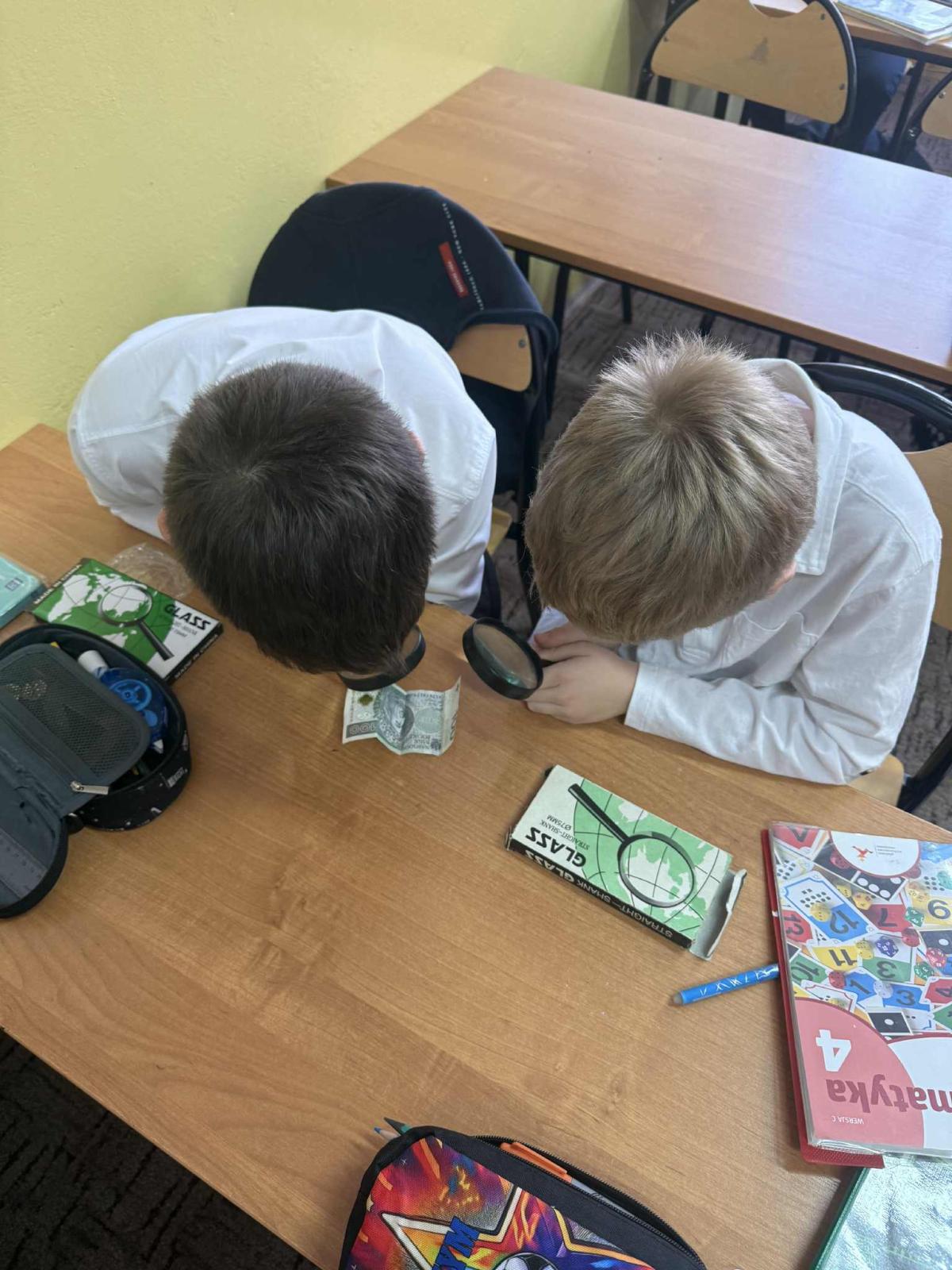 Korzystając z lup, uczniowie oglądali banknoty oraz ich zabezpieczenia, takie jak znaki wodne, mikrodruki czy specjalne elementy widoczne jedynie w powiększeniu. Dzięki temu mogli lepiej zrozumieć, w jaki sposób pieniądze są chronione przed fałszerstwem,